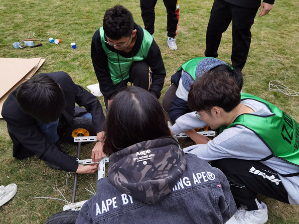 活动伊始,教练带学生们进行热身运动,随后学生们被随机分为四个小组。四个小组在在教练的指导下,分别进行了齐心协力、蒙眼互打、抢滩登陆、趣味毛毛虫、制作卡丁车等多个团体项目活动。在游戏中大家共同努力,配合默契,既讲竞技,又讲友谊;在欢声笑语中,中外学生的友情得到升华,活动也达到了高潮。尤其是在制作卡丁车过程中,中外学生同心协力,充分发挥想象力,制作出实用性强、外观漂亮的卡丁车,教练对同学们制作出的卡丁车赞叹不已,竖起了大拇指。