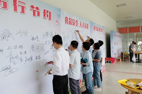 活动以“祝福祖国”、“厉行节约”、“食品安全人人有责”三个部分展开,培养党员和师生家国情怀,引导师生珍惜粮食,从自身做起,从节约一粒粮食做起,养成理性用餐、节约用餐的习惯。校领导周桂瑾、吴慧媛、徐浪参加了活动,活动现场吸引了很多师生,师生纷纷在签字版上签名,写上对祖国的祝福和自身的承诺。