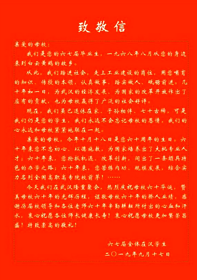 活动现场气氛热烈,30余位年过七旬老校友高唱《农机校校歌》和《共创辉煌-幻影网页版之歌》,齐声朗诵献给母校的《致敬信》,深切的感谢母校的栽培。大家畅叙校友之谊和对母校的思念之情,无不为母校60年来取得的成就感到骄傲,衷心祝愿母校的明天更美好。