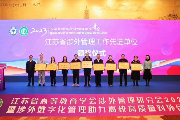 12月7日至8日,江苏省高等教育学会涉外管理研究会2023年年会暨涉外数字化管理助力高校高质量对外合作研讨会在镇江召开,省内本专科80余所会员单位参会,江苏省教育厅国际合作与交流处处长施蕴玉、江苏省高等教育学会会长丁晓昌出席会议并致辞。经书面申请、现场答辩、大会常务理事会评审、省教育厅审核等程序,我校再次获评“2023年度江苏省涉外管理工作先进单位”。