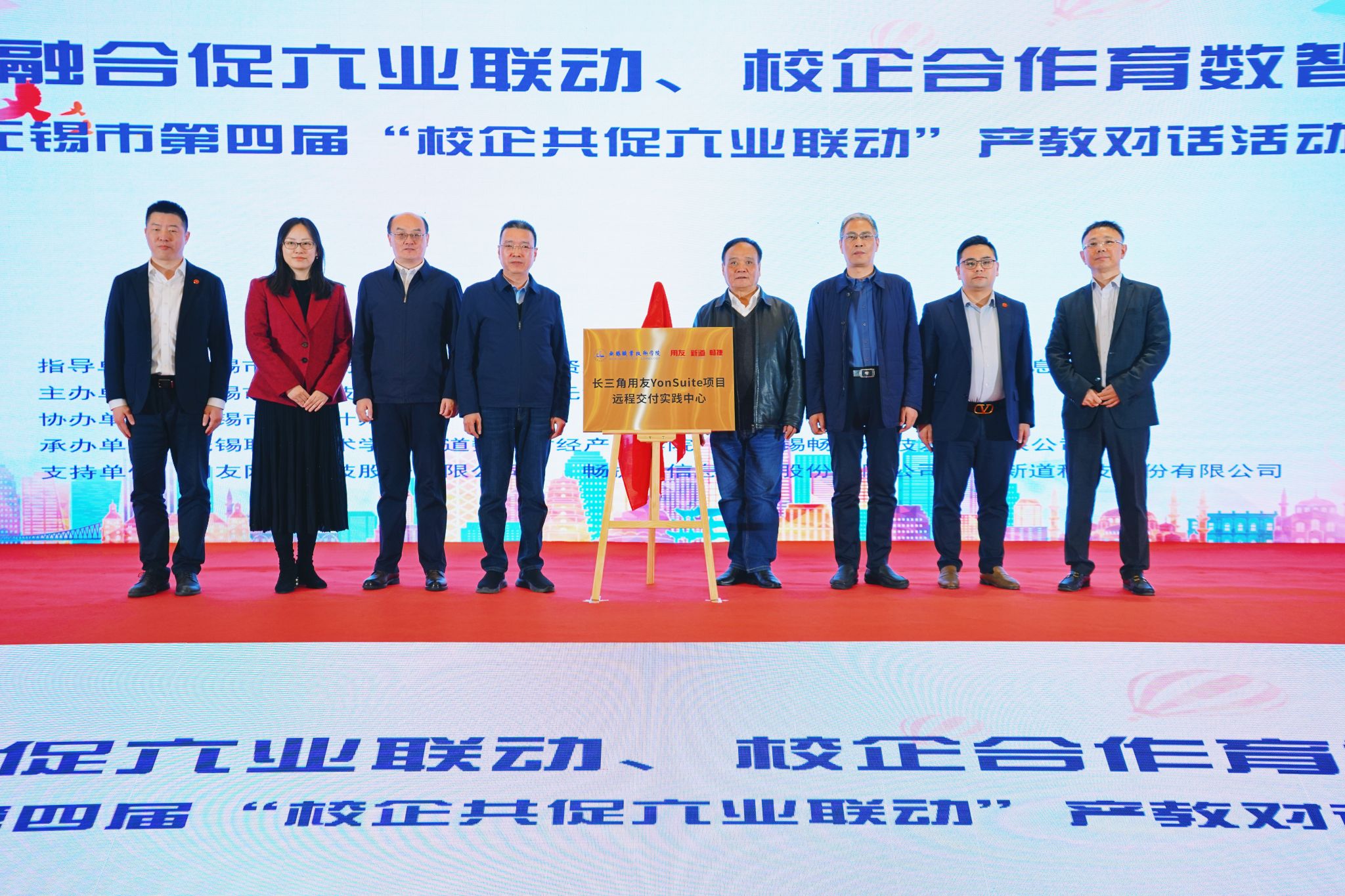 会上,我校财经学院、用友网络科技股份有限公司、新道科技股份有限公司和无锡畅捷科技发展有限公司联合成立的“长三角用友 YonSuite 项目远程交付实践中心”正式揭牌;我校财经学院、无锡商业职业技术学院会计金融学院、无锡城市职业技术学院会计学院、无锡开放大学财经与管理学院、无锡立信高等职业技术学校、无锡旅游商贸高等职业技术学校、江苏省江阴中等专业学校、新道科技股份有限公司、京东乾石科技股份有限公司和无锡畅捷科技发展有限公司联合成立“无锡市数智(联合)产业学院”。