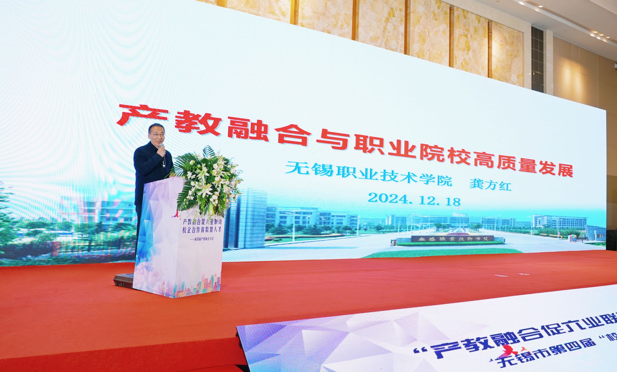 活动以“产教融合共促六业联动、校企合作共育数智人才”为主题,在无锡市教育局、无锡市人力资源和社会保障局、无锡市工业和信息化局的指导下,由无锡市职业技术教育学会与无锡高职院校发展联盟主办。无锡市人民政府教育督导室专职副主任冯益民、无锡市人力资源和社会保障局副局长沈挺和无锡市工业和信息化局副局长肖彬到会致辞。无锡市高职院校发展联盟理事长、我校党委书记龚方红以《产教融合与职业院校高质量发展》为题向与会嘉宾分享了学校探索校企合作、并跑产业、技术引领和科教融汇的锡职经验。