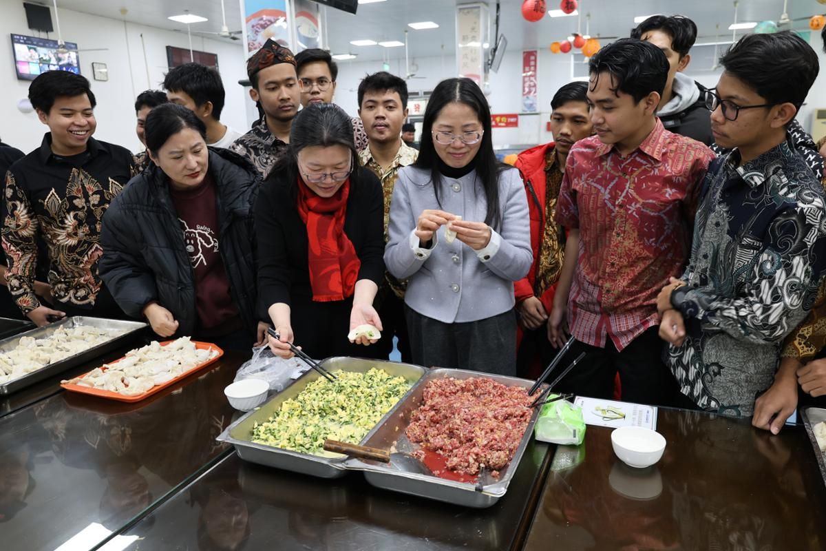 团拜会现场,师生一边交流着包饺子的技巧,一边分享着家乡的风俗和趣事,在欢声笑语中,一个个形态各异的饺子诞生了。留学生们还身着各自民族的传统服饰,载歌载舞,跨越国界,共享多元文化交融的欢乐。