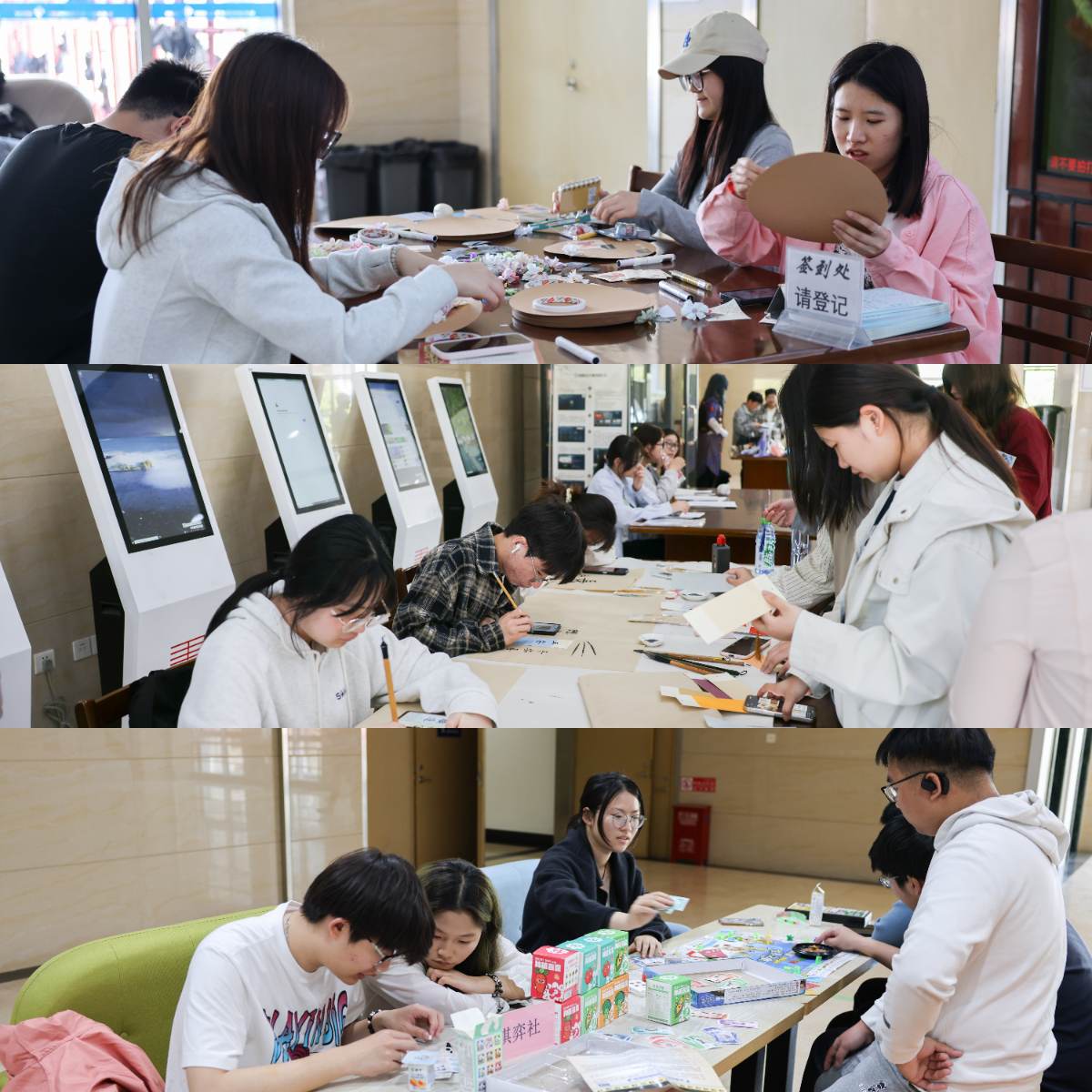 “书馆游园会”社团展示体验活动在一楼大厅和二楼中庭热闹开展,现场人头攒动,气氛热烈。书法艺术、棋类游戏、非遗卡纸彩色刮画、影谜猜猜乐等社团展示活动吸引了众多读者的参与。在图书馆惜花园,校团委举办的“书香蠡溪 阅享未来”青春荐读会,为青春学子提供了一个分享心得、交流感悟的平台。