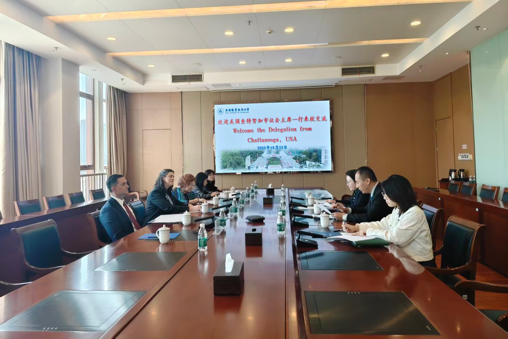 10月22日,美国查特努加市议会主席珍妮·希尔率领代表团来校访问。我校副校长吴慧媛及国交处相关负责人参加交流座谈。