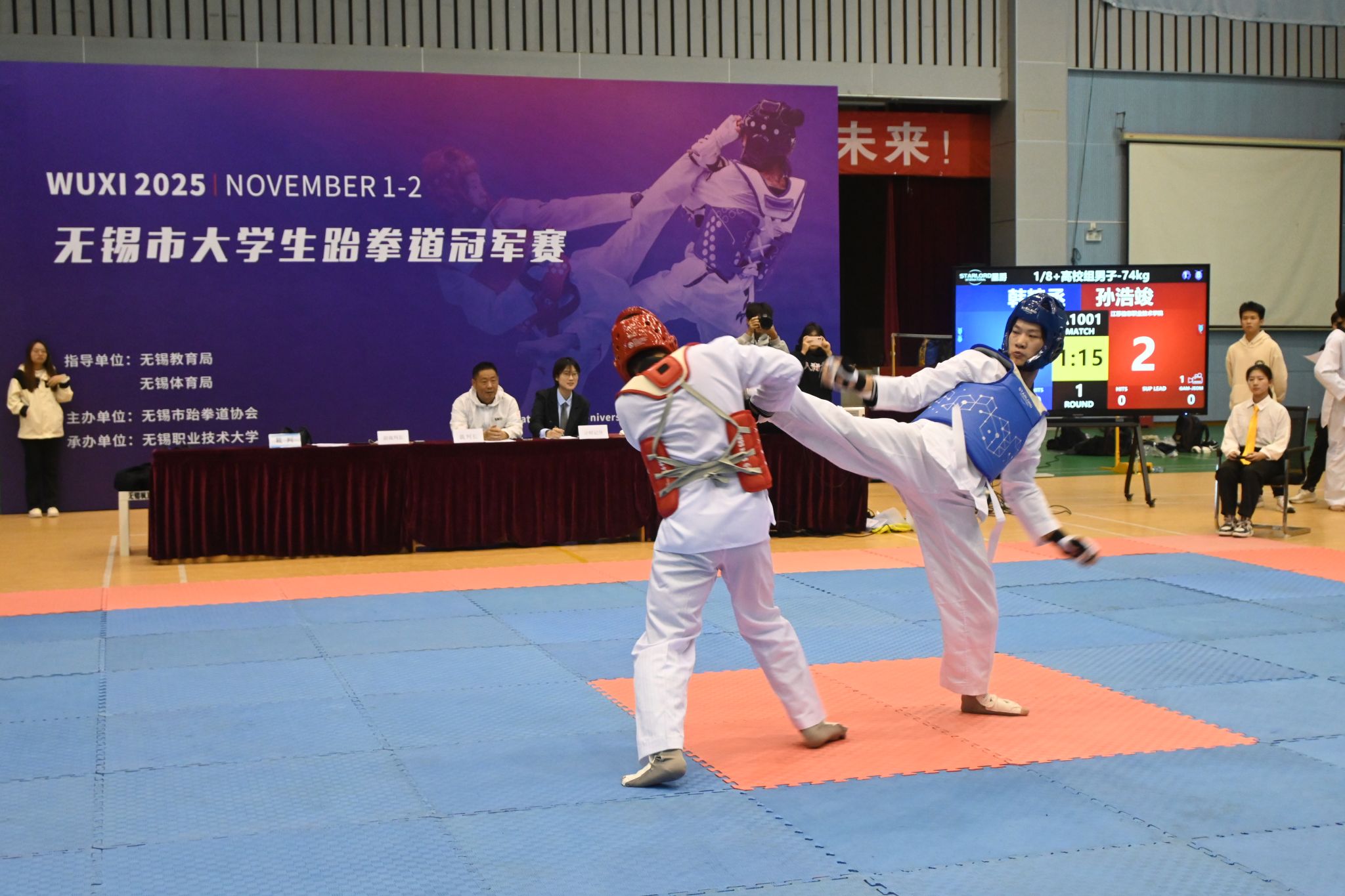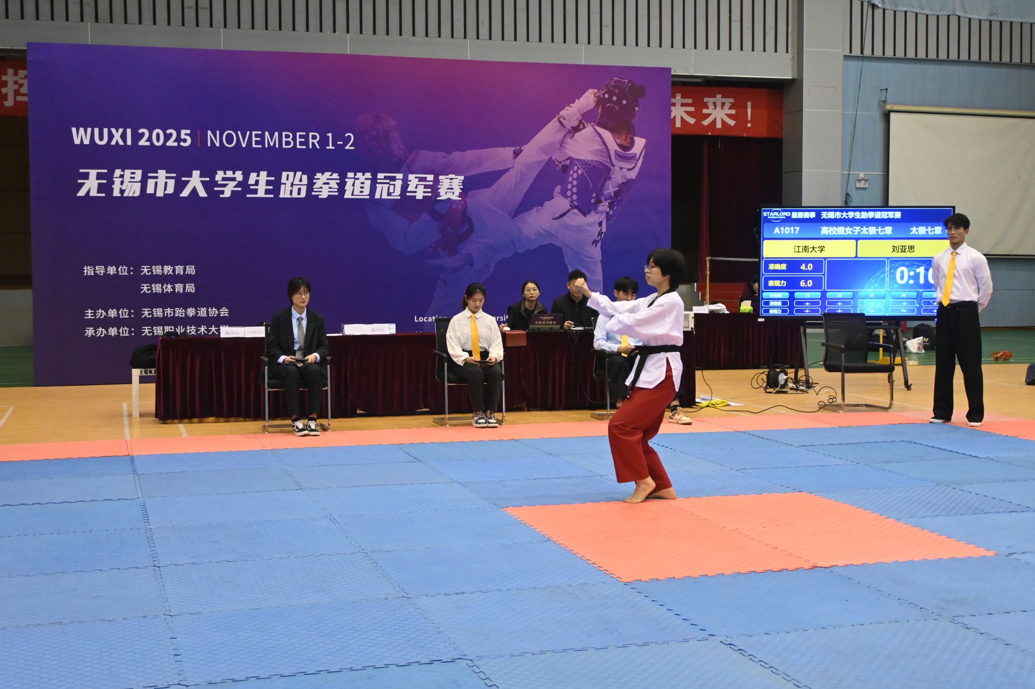 11月2日,2025年无锡市大学生跆拳道冠军赛在我校体育馆举行。本次赛事由无锡市跆拳道协会主办,吸引了来自江南大学、无锡学院等多所高校的近100名学子踊跃参赛,共同上演精彩绝伦的跆拳道竞技盛宴。