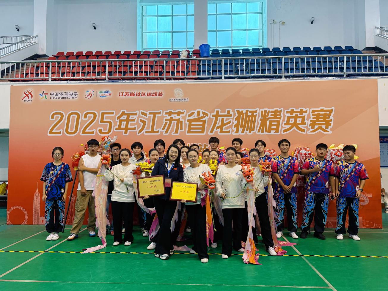 11月1日,江苏省龙狮精英赛在常州落幕,我校代表队斩获两项比赛一等奖。本次比赛由江苏省体育局、江苏省体育总会主办,江苏省龙狮运动协会承办,设有舞龙、舞狮、彩带龙三大项目,吸引了来自常州、苏州、无锡等地36支代表队的400余名运动员参加。