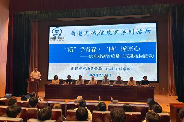 9月24日,在全国“质量月”期间,由无锡市市场监督管理局和机械工程学院共同承办的“‘质’手青春,‘械’逅匠心——信仰对话暨质量工匠进校园活动在厚德楼一楼报告厅顺利举行。市监局四级调研员张强、质量发展处处长杨瀚博、首届“十大工匠”代表丁浩、杨岳民、我校副校长强伟纲、机械工程学院领导班子、学院特聘技能大师——“大国工匠”顾秋亮、相关老师和200余名学生参加本次活动。