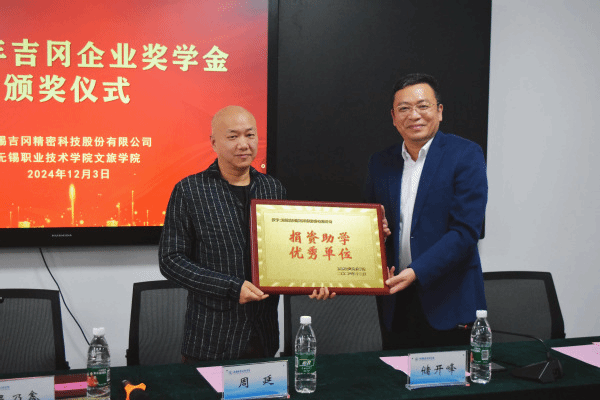 据悉,无锡吉冈精密科技股份有限公司深耕制造业二十余年,在行业内处于领先地位,是江苏省专精特新企业、江苏省高新技术企业、无锡市首家北交所上市企业。公司已连续八年每年捐资10万元用于奖励和资助我校品学兼优学生,覆盖全校所有二级分院,在师生中有着良好的口碑和广泛的影响。