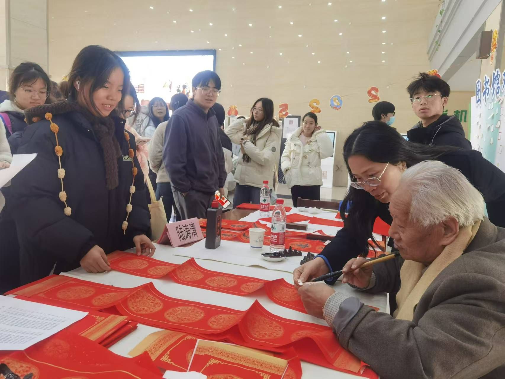 12月24日下午,图书馆携手校读者协会、书法协会共同举办新年“送春联”文化活动。此次活动在图书馆一楼大厅举行,特邀我校退休职工陆涛清老先生与书法协会的同学现场书写春联和福字,送上新年的祝福。校党委副书记杨雪琴莅临活动现场,向师生们致以节日的祝福。