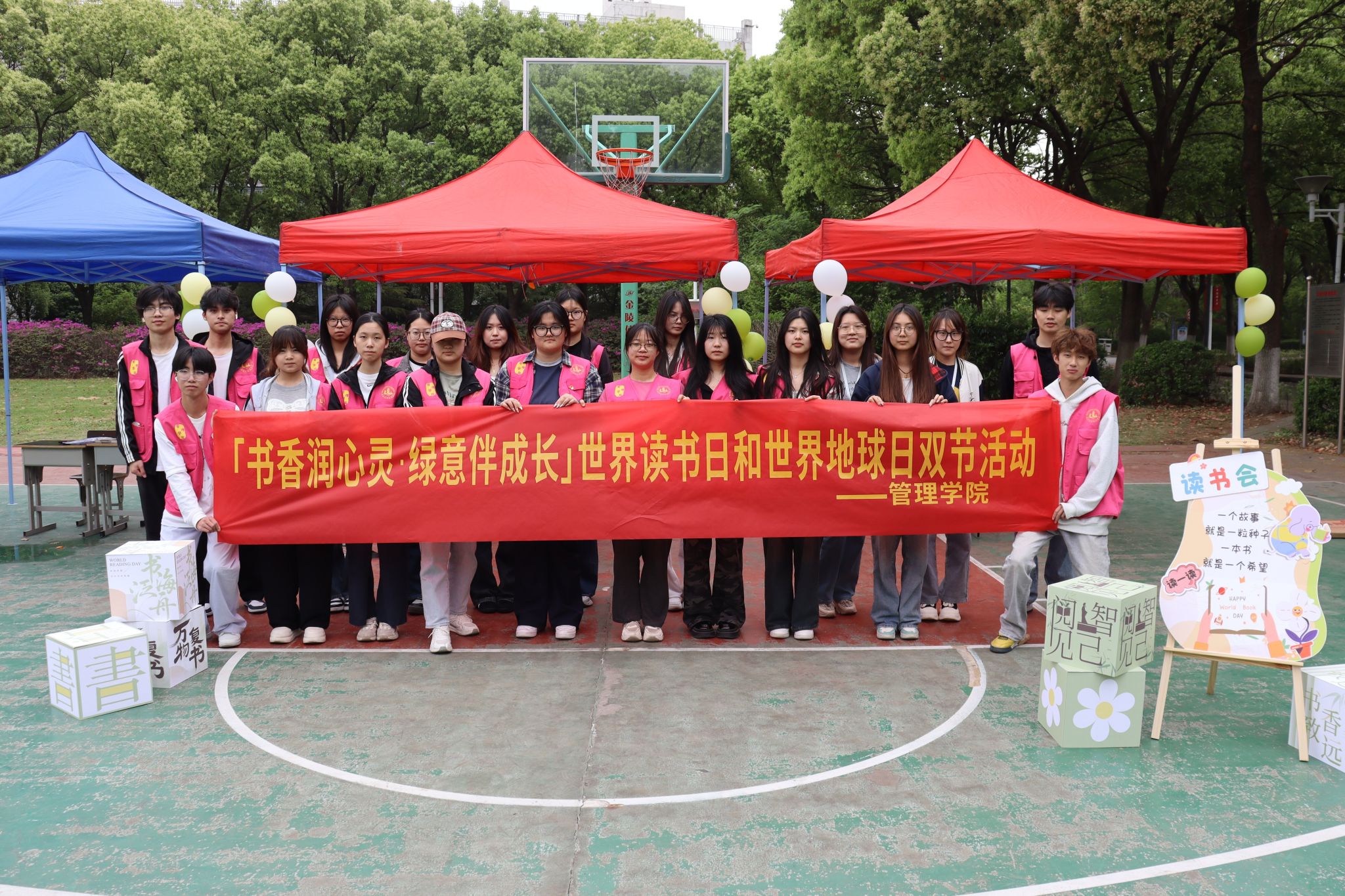 书籍是人类的阶梯,地球是万物的家园。在“4.22世界地球日”和“4.23世界读书日”双节到来之际,为进一步营造校园美好和谐环境,激发师生阅读兴趣,4月22日下午,管理学院在兰园篮球场举办以“书香润心灵·绿意伴成长”为主题的活动。此次活动共吸引全校师生200余人,旨在将“绿意”与“书香”相结合,开启一场特别的文化与环保之旅。