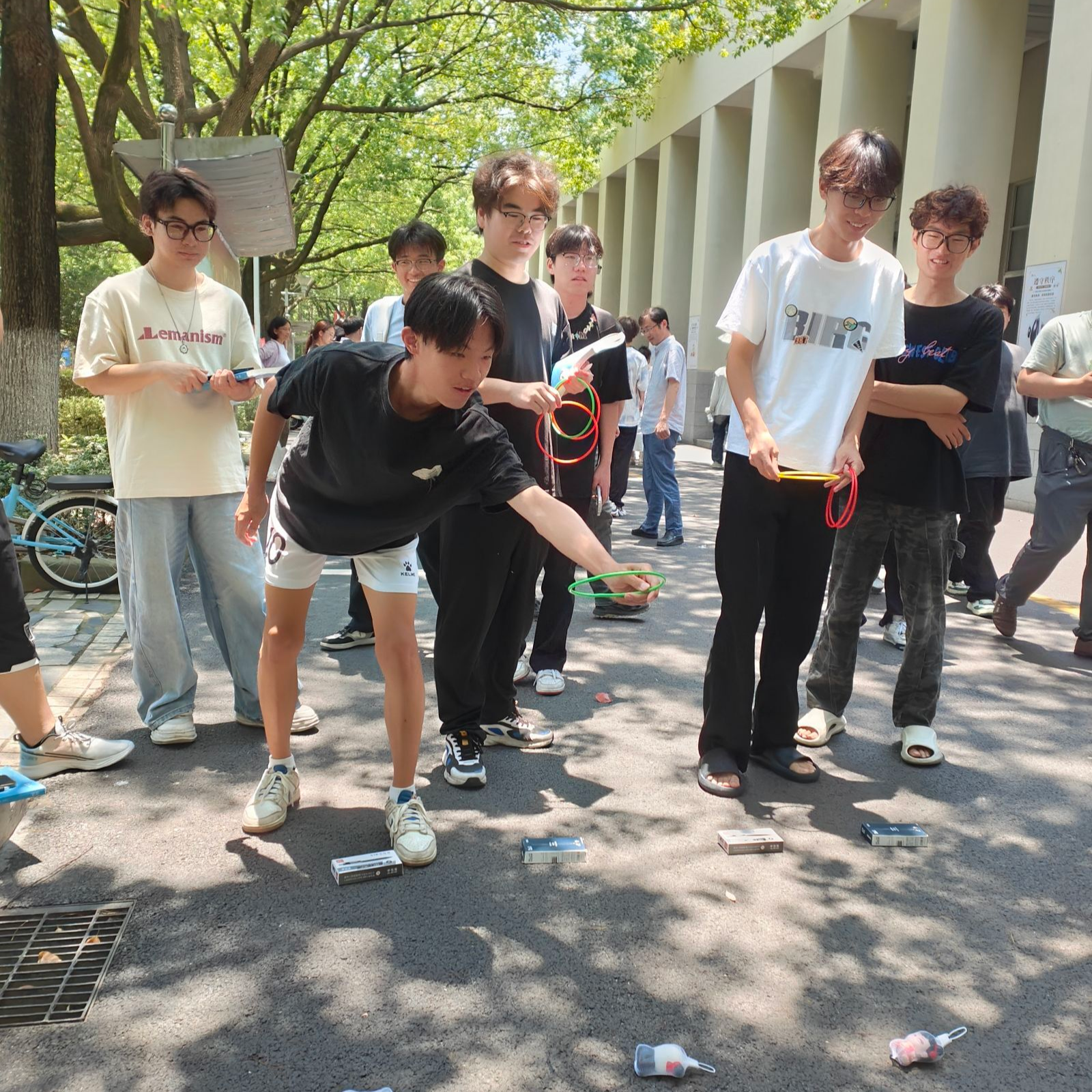 活动现场共有两种形式供同学们选择:一是解压墙——同学们“撕掉负面话语,贴上正面话语”;二是套圈街——“瞄准未来,圈力以赴”。让同学们在轻松愉快的氛围中放松心情,缓解学习的疲惫。在“解压墙”前,同学们纷纷写下代表压力的词语,用力将其撕下,仿佛卸下重担;又郑重贴上写满鼓励和期许的便签,展板上迅速被“加油!”“你可以的!”“我要拿国一!”等励志话语填满。另一边,“套圈街”同样人头攒动,党员教师们在维持秩序的同时,不时弯腰指导、加油鼓劲。同学们全神贯注地瞄准目标,每当有人套中象征“小目标”的奖品,人群中便爆发出阵阵欢呼和掌声。教师们穿梭其间,或帮忙捡拾圈环,或分享小技巧,或为参与者喝彩,他们热情周到的服务让整个活动充满了轻松愉快的氛围,有效地帮助同学们在趣味互动中释放了期末的紧张与疲惫。