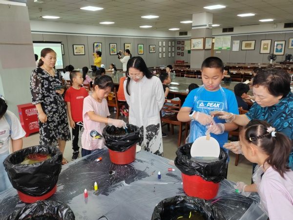 6月27日上午的“古意新韵 彩绘夏日”非遗漆扇制作体验中,图书馆的老师向孩子们介绍了漆扇的历史背景、制作流程和文化价值。穿好围裙戴上手套,孩子们在老师的指导下,向水桶中滴入不同颜色的大漆,调配与稀释后放入团扇,旋转抖动,出水的团扇便有了独具一格的配色和纹样。漆扇晾干后,孩子们还拓上了喜爱的印章。