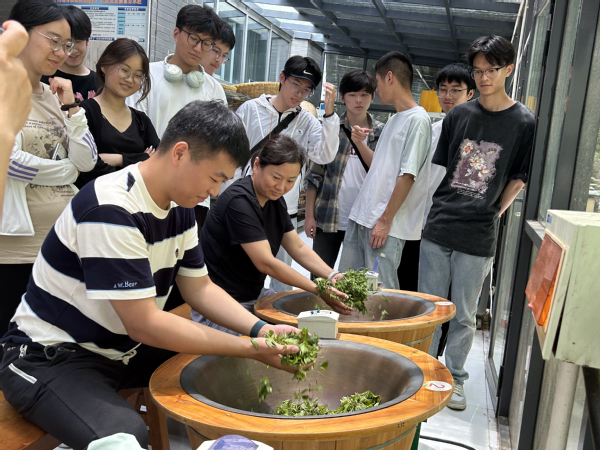 采摘结束,同学们把各自的成果汇聚起来,前往茶研所,在茶研所,马院的师生跟着高级茶艺师欣赏学习了绿茶的泡茶工艺;参观了解传统制茶流程:采青、晾青、炒青、揉捻、干燥。老师和同学们还亲身体验茶叶炒青制作,在茶研所老师的指导下,双手在锅里不断翻炒、揉搓,茶叶的颜色、大小逐渐改变,散发出沁人心脾的茶香,更为神奇的是,同样的茶叶和炒茶工具,每个人炒出的茶叶香气差异较大。深入的学习体验让同学们感受到中国茶文化的独特魅力,自己全程制作的劳动成果更让同学们感到无比珍贵。机制23401班的张新昊同学说:“我们这次的采茶体验也在拿到我们的劳动成果后而告一段落,心中还是有些留恋不舍的,毕竟也是人生难得的一次体验,投入的也比较认真,收获的也不少,给了我机会去尝试除学习外的其他活动,感受劳动的汗水和收获的喜悦,我将会铭记一辈子。”