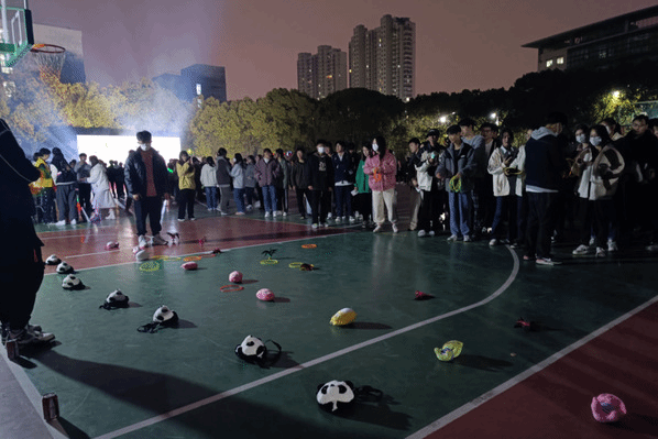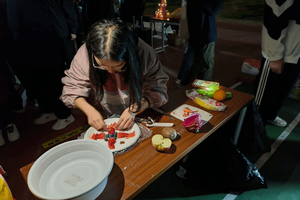 近800名师生参与,现场人头攒动,热闹非凡。本次活动分为七个参赛区域:党史知识竞赛和音乐美食知识竞赛区、大胃王比拼区、水果拼盘大赛区、投壶游戏区、套圈游戏区、音乐分享区和趣味运动区。工作人员为同学们准备了丰富可口又卫生的经典小吃和蛋糕,参加活动的同学只需完成游园活动并打卡即可获得美食或精美礼品。虽然天公不作美,但同学们热情洋溢让活动现场氛围十足,每个活动项目前都排着长长的队伍,大家都迫不及待的要享受这场身心放松的美食音乐节盛宴。同学们或歌唱或套圈或投壶或做水果拼盘或运动或参加美食文化知识答题,好不热闹。
