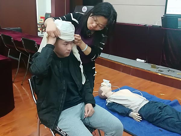 培训将理论教学、实践操作紧密结合,徐瑾老师以详尽的实例讲授了现代救护的概念,向学员们讲解并演示了心肺复苏术的技术要点,专业视频的动作分解,《白金十分钟》MV和“心肺复苏歌”《staying alive》激发了大家动手演练的热情。学员们还在老师的指导下完成了三角巾头部包扎等技术操作,就日常生活中遇到的脚踝扭伤、溺水等情况的救护步骤进行了咨询。现场互动频繁,气氛热烈。