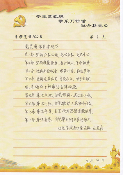 围绕“两学一做”学习教育内容,结合校办监察处布置的廉洁文化活动安排,财经学院党支部于5月24日在J2-408组织开展了“学党章党规 手抄自律准则”活动,并观看了警示教育片。