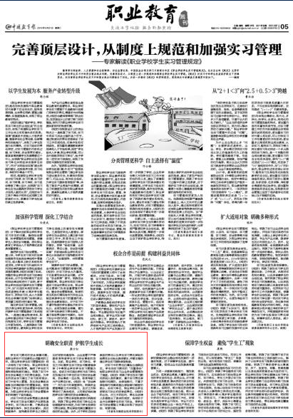 学生实习期间的安全保障问题,是职业学校不可回避和必须重视的工作。《职业学校学生实习管理规定》进一步规范了实习单位、职业学校和实习学生的安全职责,推进了学生实习强制保险制度的建立,明确了实习中发生安全事故三方的责任承担,为学生的安全实习建立了实习前有培训、实习中有专人管理、发生安全事故后能够及时得到赔付的管理系统,有效解决了学生实习安全管理中面临的难题,为职业学校学生实习安全管理体系的构建打下坚实基础。