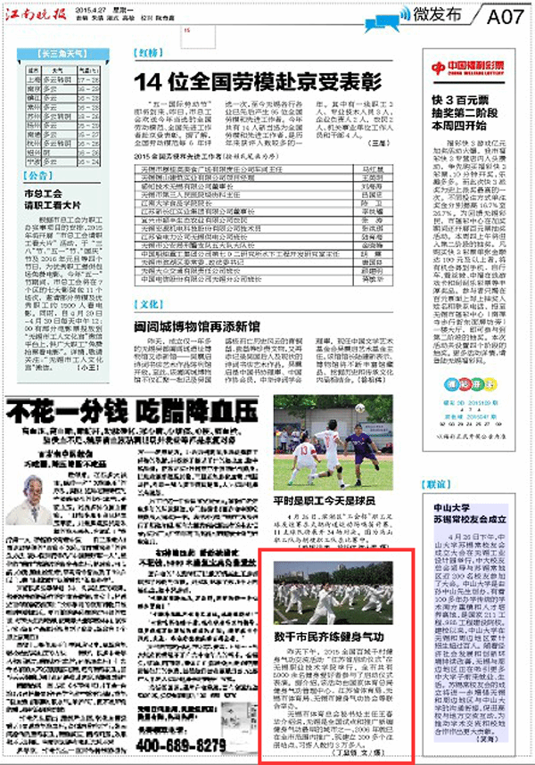 昨天下午,2015全国百城千村健身气功交流活动“江苏省启动仪式”在幻影网页版举行,全市共有5000余名健身爱好者参与了启动仪式表演。据介绍,该活动由国家体育总局健身气功管理中心、江苏省体育局、无锡市体育局、无锡市健身气功协会等联合举办。