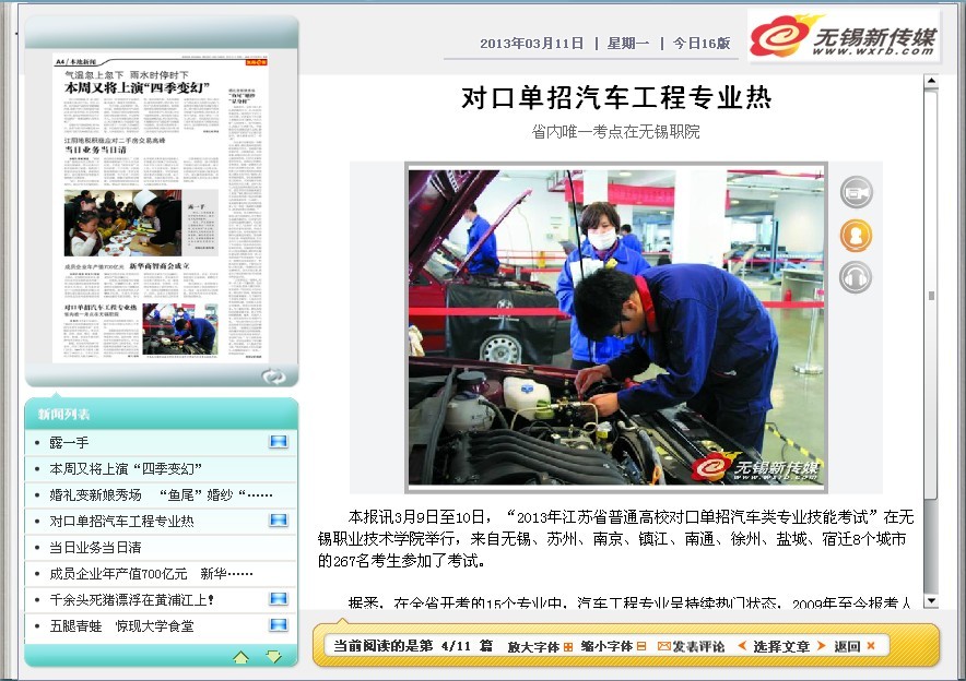 据悉,在全省开考的15个专业中,汽车工程专业呈持续热门状态,2009年至今报考人数增长了10倍以上。今年江苏省对口单招报名人数为29817人,全省共设专业技能考点23个,无锡今年对口单招大约有上千考生。幻影网页版作为江苏省高校对口单招汽车专业大类联考委牵头学校,是省内唯一的汽车类专业技能考试考点,至今已连续5年组织了该项考试。专业技能考试成绩将于4月2日公布,专业技能成绩合格且参加文化统考的考生方可参加对口单招志愿的填报。(郁飞 宦玮)