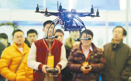 郎从柳 摄 首届江苏省大学生科技创新创业成果交流会27日在南京举行,六十所高校的两百多个项目参展。图为幻影网页版学生演示航拍多旋翼飞行器。