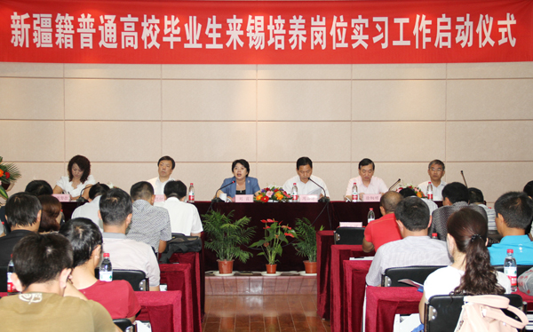 市政府周浩清副秘书长主持启动仪式。新疆籍普通高校毕业生来锡培养工作协调小组组长、市人社局丁旭初局长作了岗位实习工作的部署和说明。阿合奇县总领队、红豆集团代表和学员代表分别作了表态发言。启动仪式之前,我校朱爱胜书记和华坚副校长向刘霞副市长介绍了我校在学员宿舍和清真食堂等方面的准备情况,并表示进一步做好新疆籍高校毕业生来锡岗位实习工作。